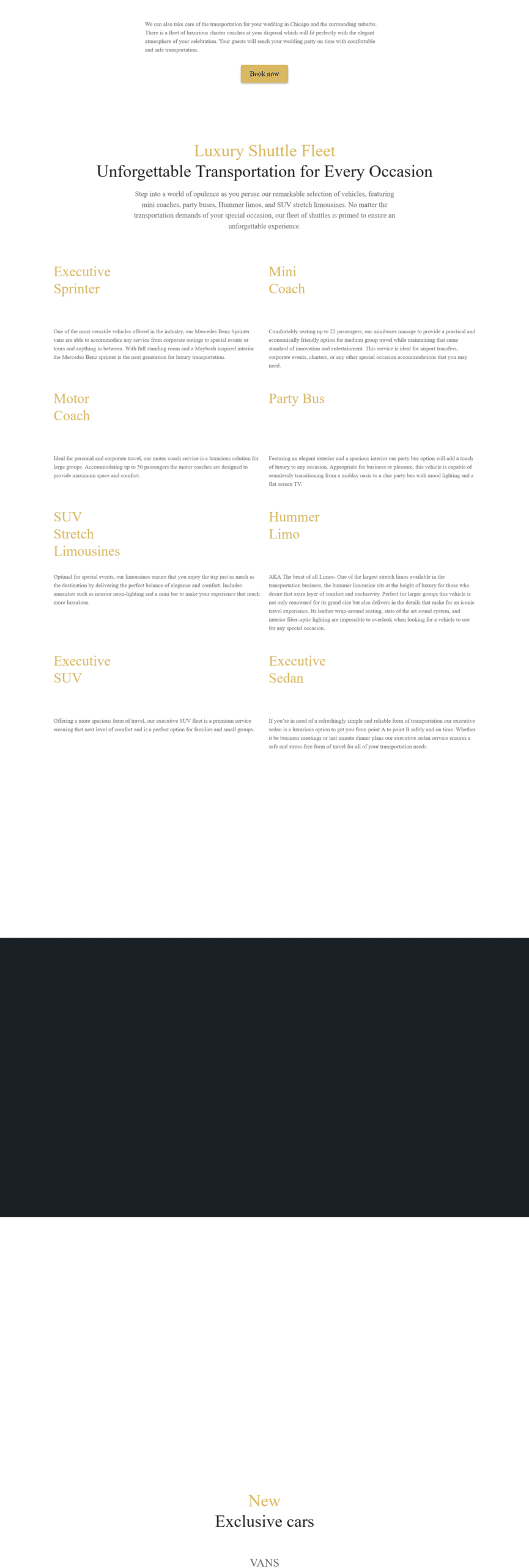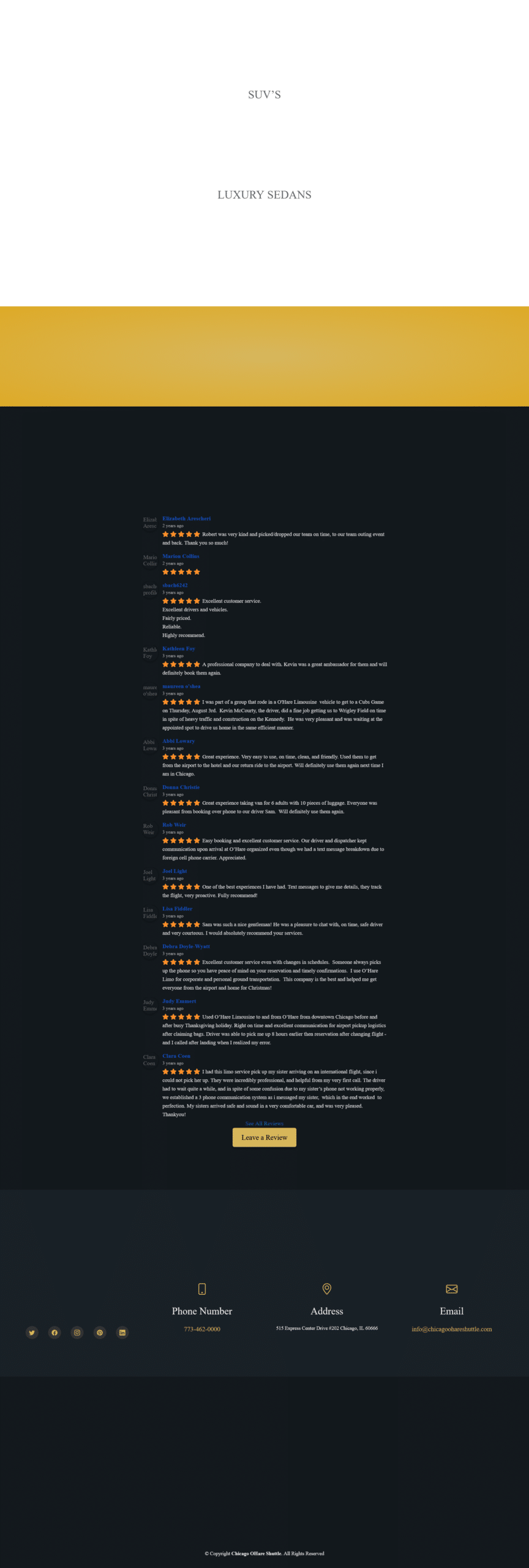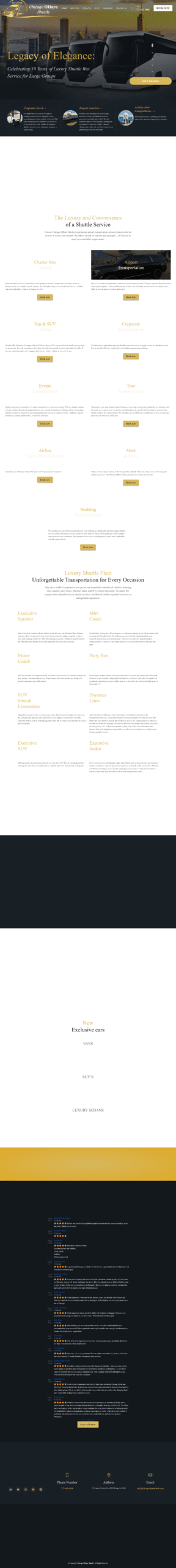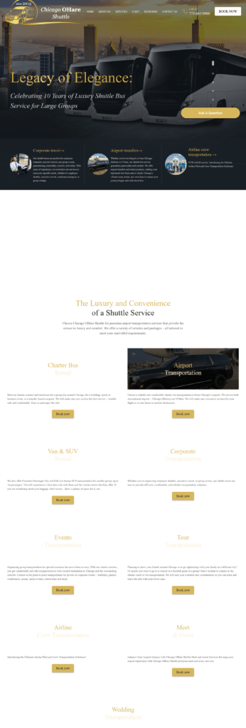 The Chicago O’Hare Shuttle website features sleek, professional design emphasizing luxury and premium service with high-quality vehicle photography and dark backgrounds with gold accents. Built on WordPress, the homepage displays a dynamic slider showcasing decade-long heritage, luxury fleet, and diverse service offerings.