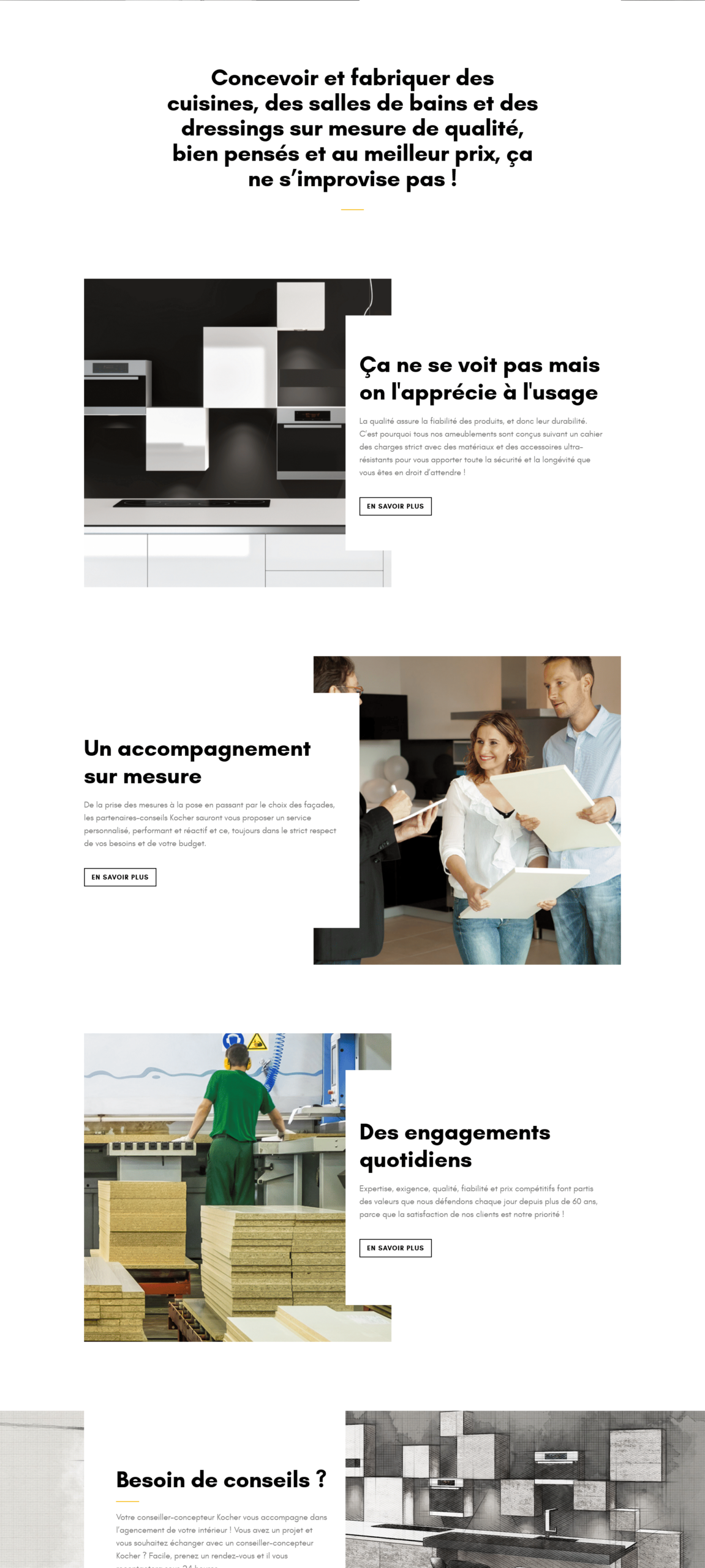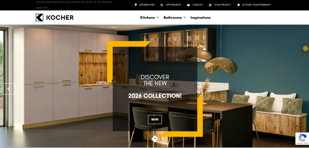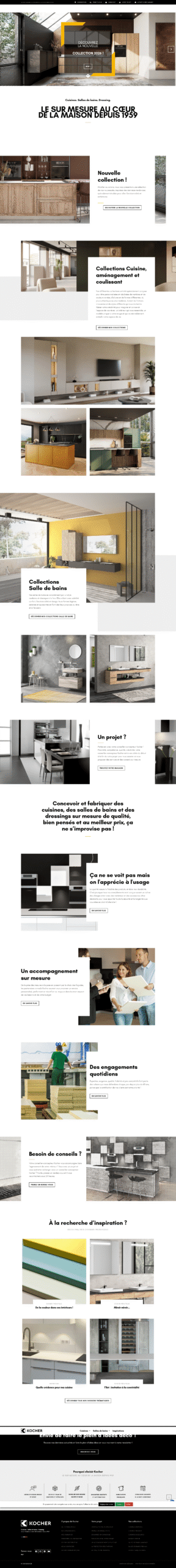 The Cuisines Kocher website is designed with an elegant, sophisticated French aesthetic that reflects the brand’s premium positioning and heritage craftsmanship. Built on WordPress with Elementor, the site features a luxurious design system with refined typography, elegant color palettes, and high-quality 3D rendered photography showcasing modern kitchen, bathroom, and dressing room installations. The homepage implements a full-width slider featuring the 2026 collection with stunning product visualizations and decorative corner elements that add a distinctive branded touch.