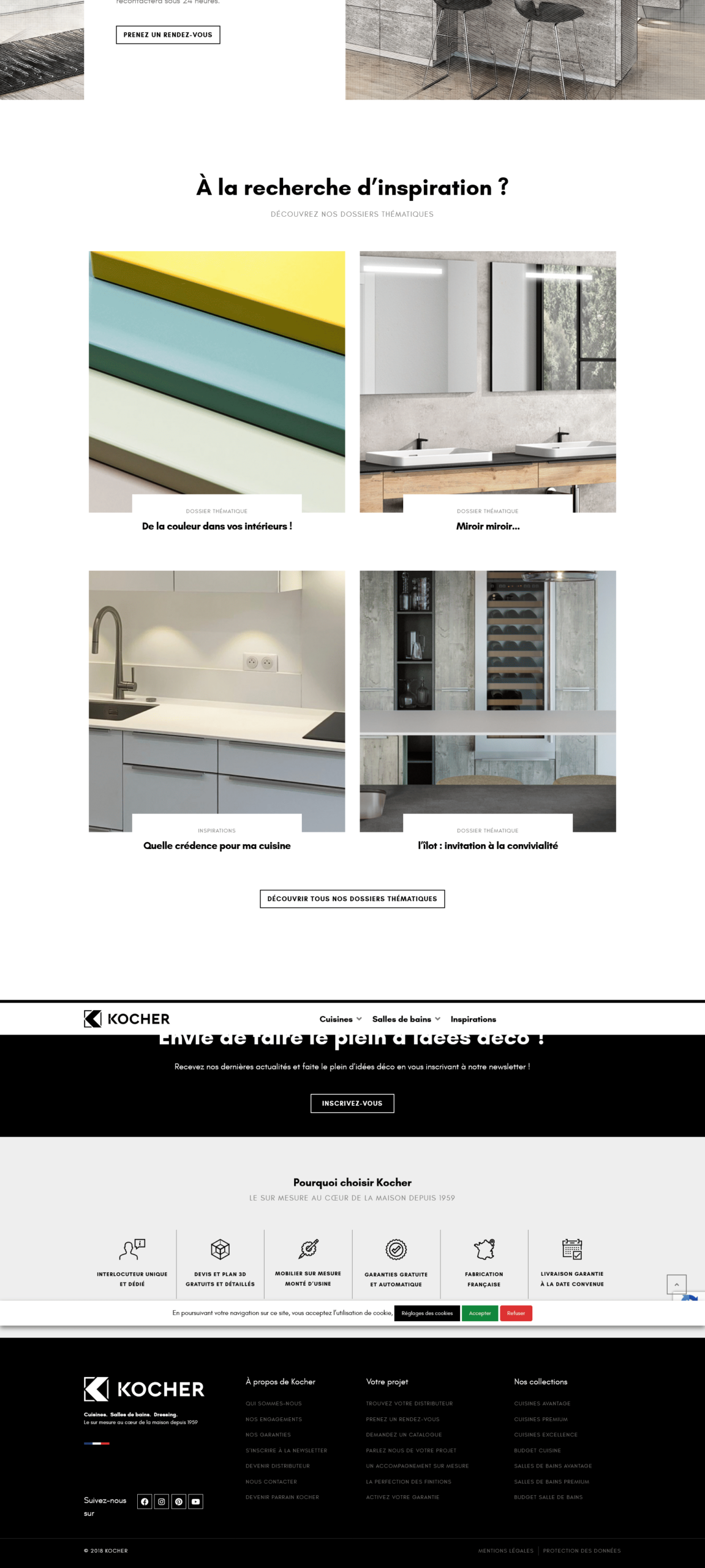 The inspirations section functions as a content hub with thematic guides, decorating tips, project showcases, and trend reports. Technical implementation includes Facebook Pixel for marketing tracking, Google Analytics for user behavior analysis, GDPR-compliant cookie consent management, social media integration (Facebook, Instagram, Pinterest, YouTube), mobile-responsive design optimized for visual storytelling, and SEO optimization for French market keywords. The site successfully positions Kocher as a premium custom furniture manufacturer offering personalized service, free 3D plans, factory-assembled custom furniture, automatic guarantees, and guaranteed delivery dates.