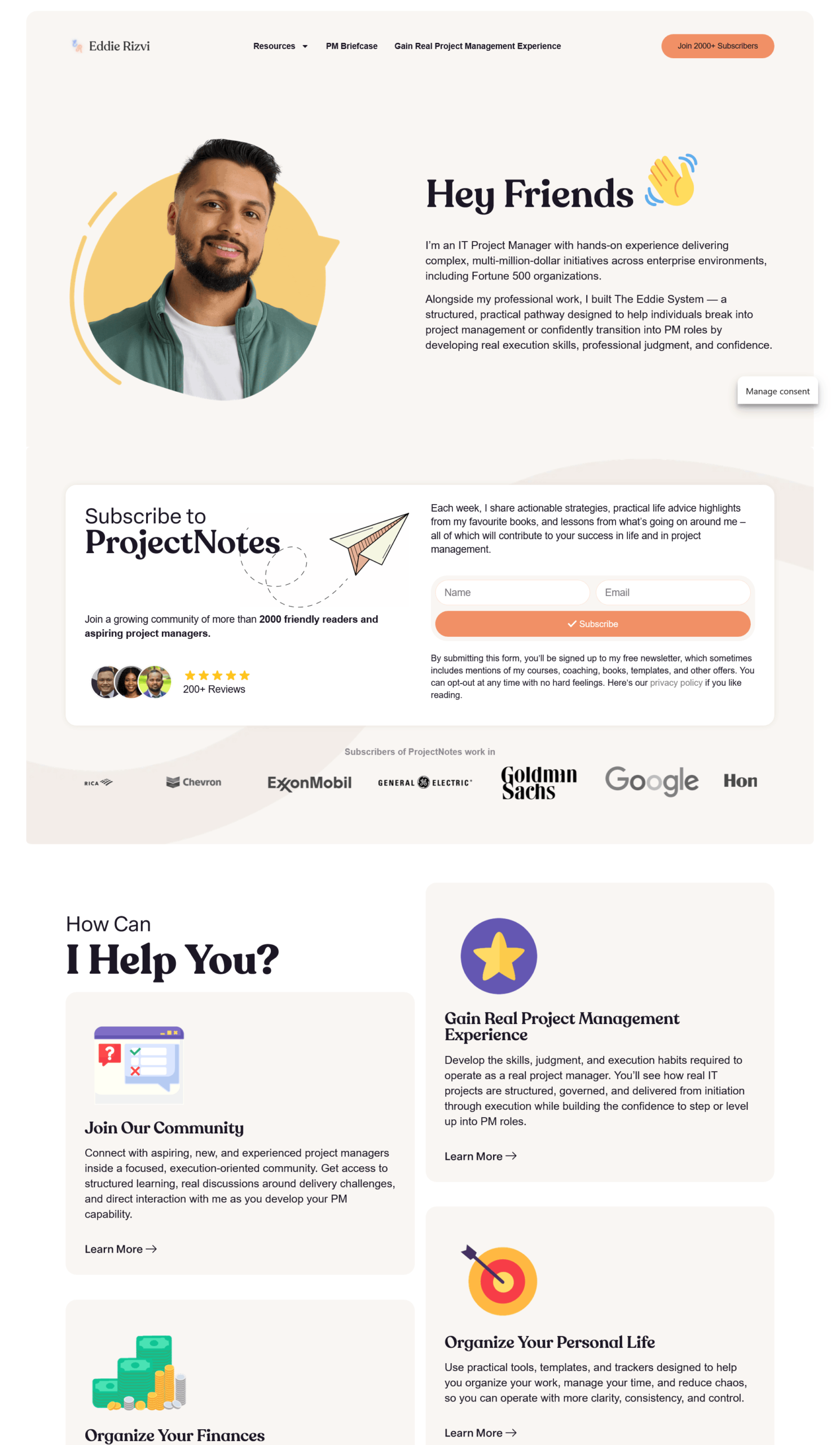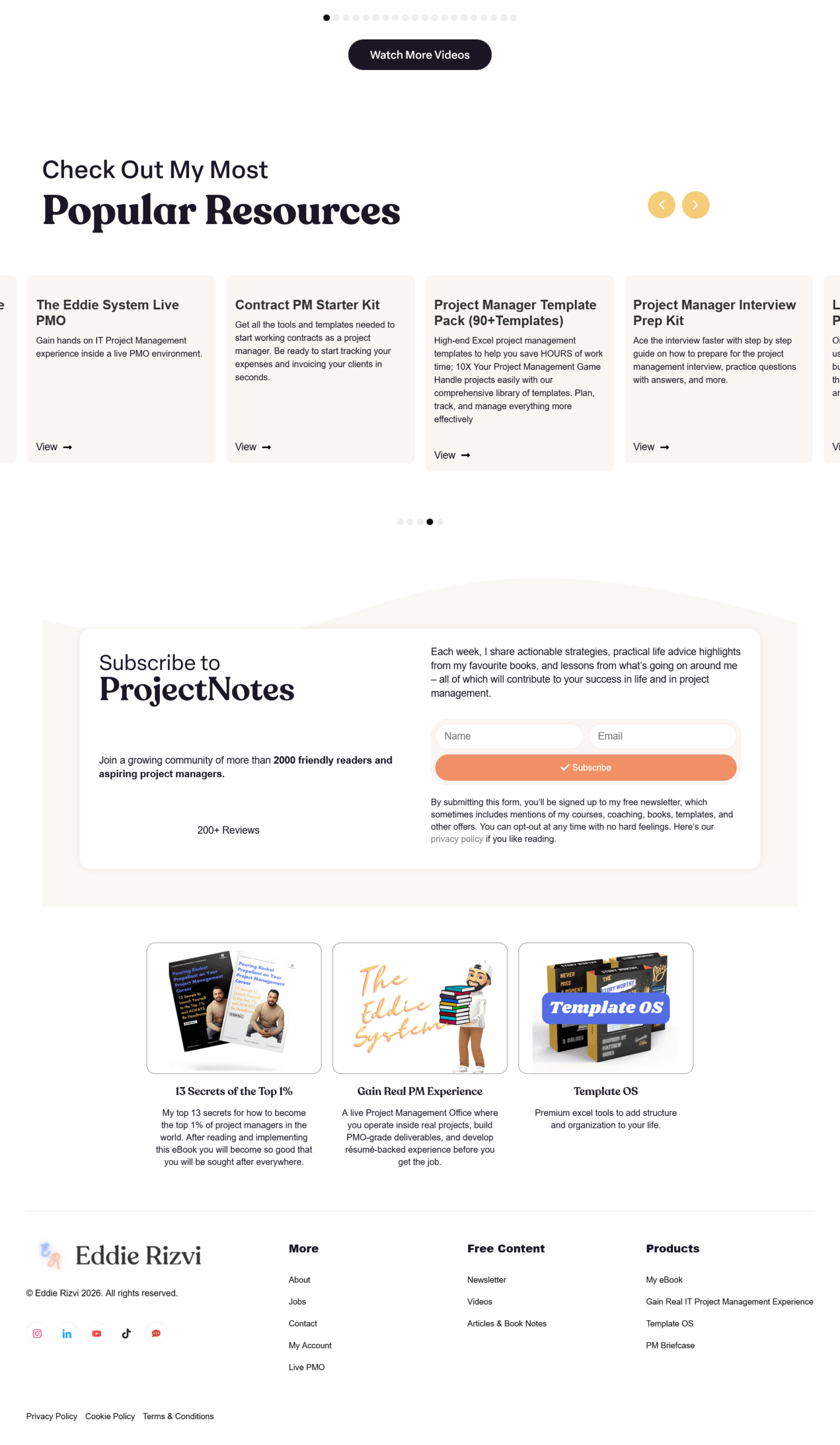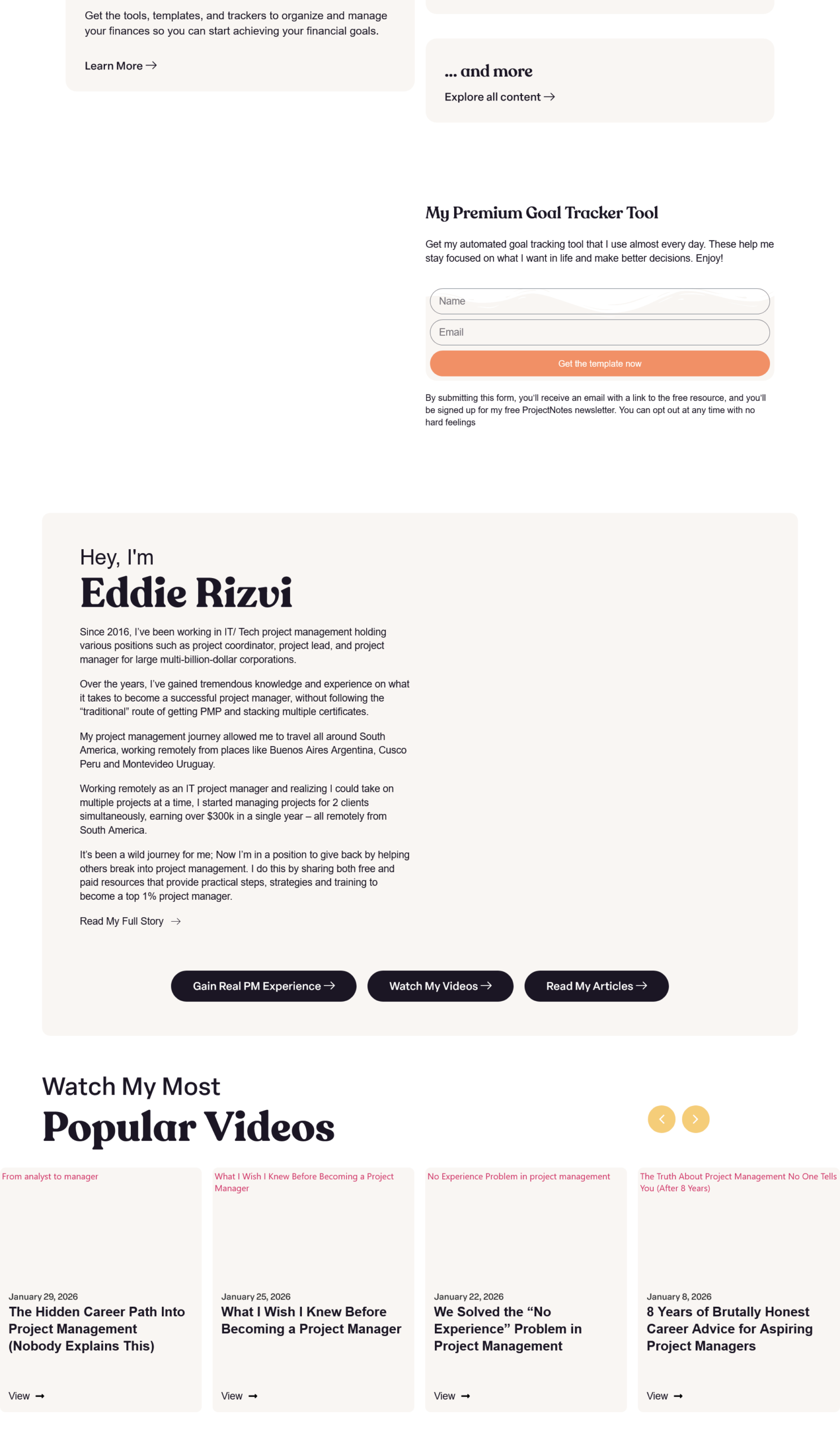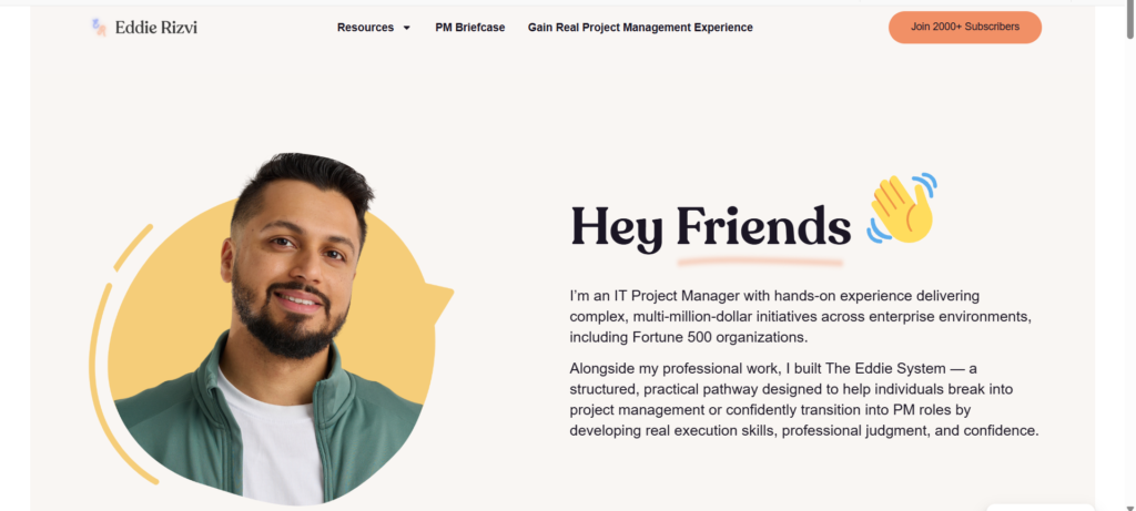 The Eddie Rizvi platform is built around The Eddie System Live PMO, where students work inside an actual Project Management Office environment to gain résumé-backed experience. The website features a clean, conversion-focused design with purple branding (#7c3aed), strategic calls-to-action, and mobile-responsive layouts. It includes multiple product offerings: 90+ premium PM templates, Template OS for life organization, Contract PM Starter Kit, and free resources like weekly newsletters and YouTube videos. The platform serves over 2,000 subscribers from companies like Amazon, Google, and Microsoft. Built on WordPress with Skool integration for community management, the site emphasizes practical skills over certifications, reflecting Eddie’s personal journey of earning $300K+ annually managing remote Fortune 500 projects without a PMP certification.