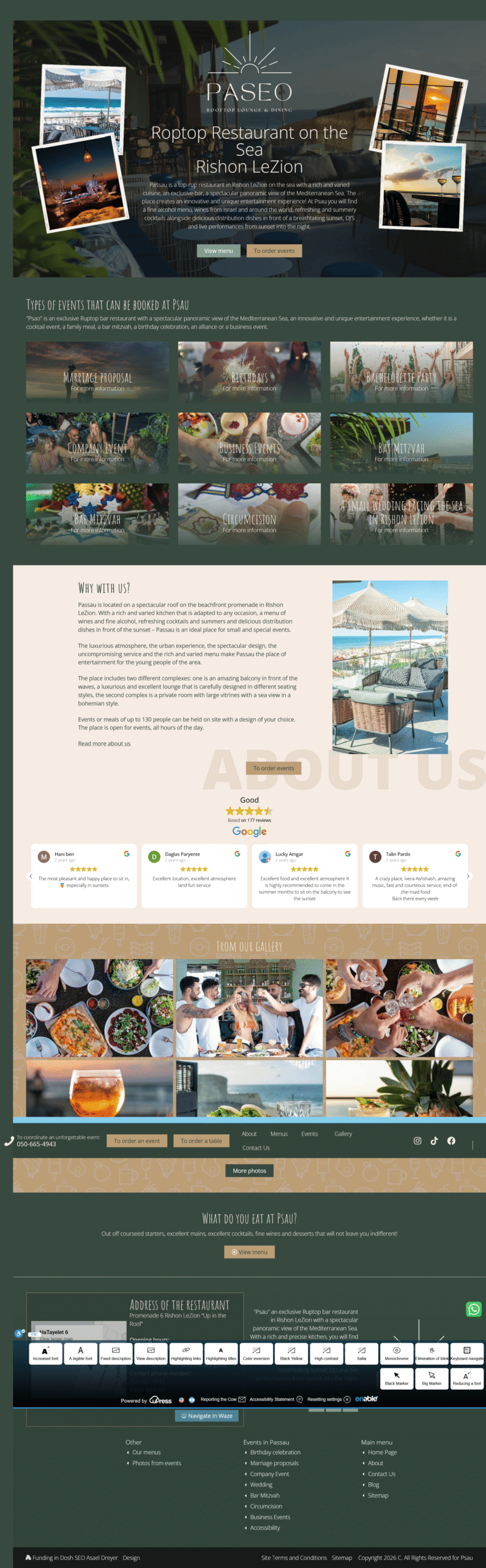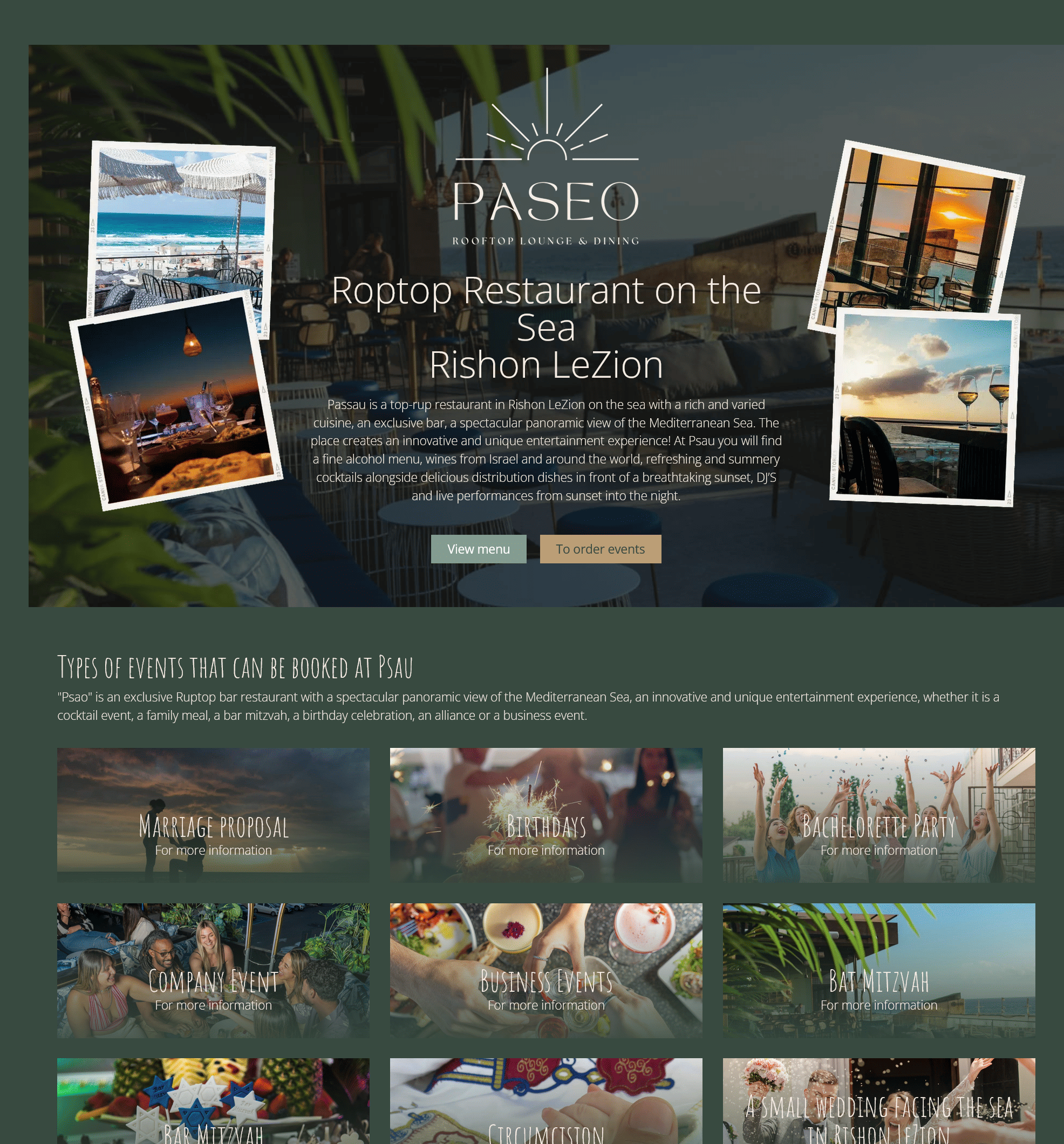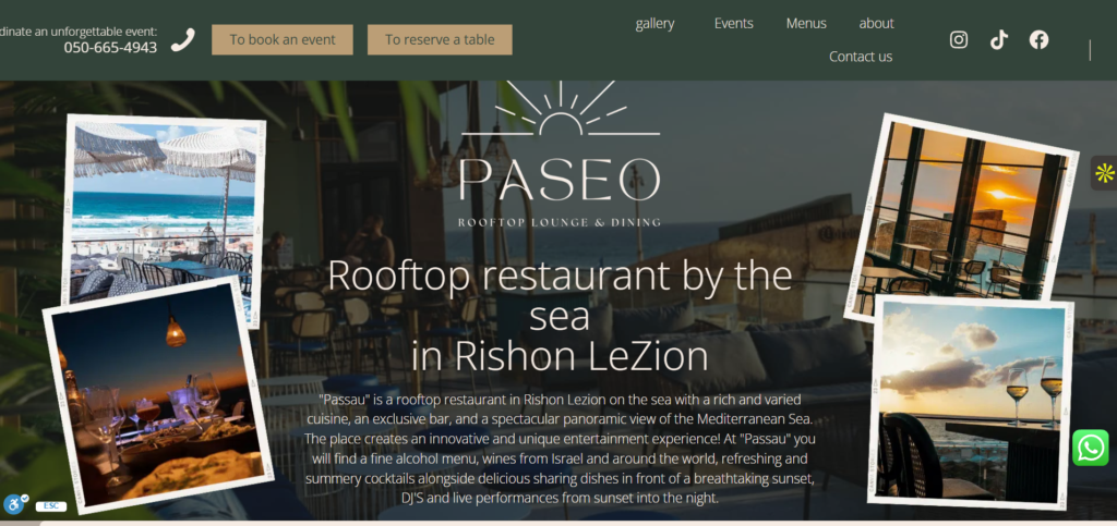 The Paseo website is designed with an elegant, upscale aesthetic that captures the venue’s premium rooftop dining experience overlooking the Mediterranean. Built on WordPress, the site features a sophisticated Hebrew RTL design with stunning photography showcasing sunset views, the bohemian-style interior, and outdoor lounge spaces. The layout emphasizes visual storytelling through full-width hero images, integrated galleries, and atmospheric photography that conveys the venue’s unique ambiance.