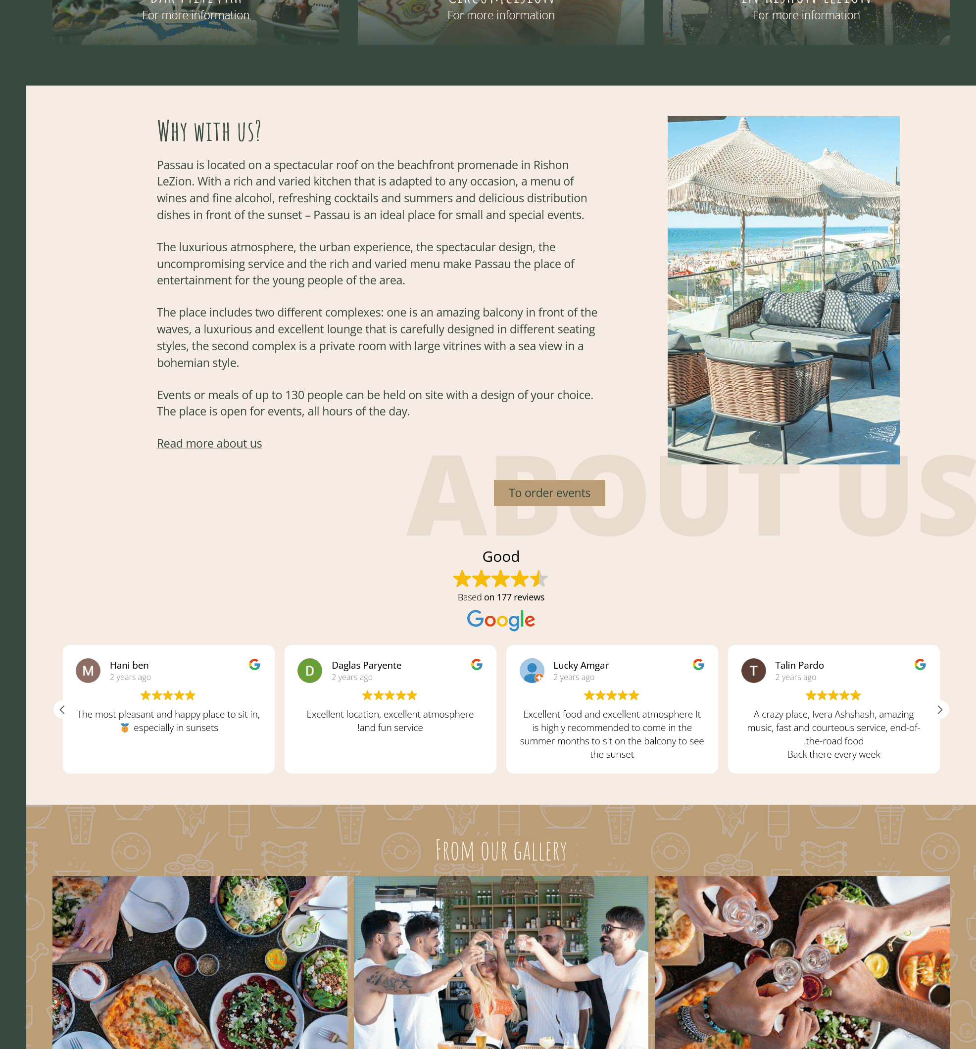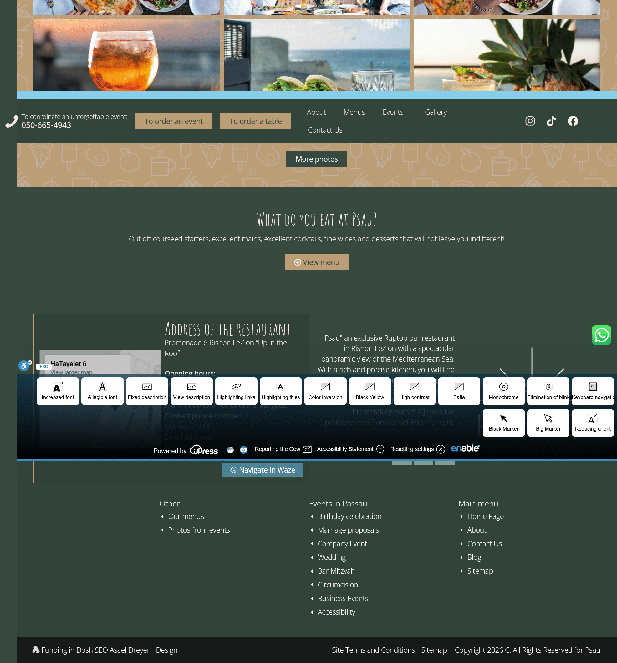 Key features include a comprehensive events section covering nine different event types (circumcision, birthdays, bat/bar mitzvahs, marriage proposals, bachelorette parties, weddings, corporate events), digital menu integration via Hopa.tech platform for seamless viewing, OnTopo reservation system integration for table bookings, Google reviews widget displaying 177+ customer testimonials with ratings, detailed event inquiry contact forms, Waze navigation integration, social media links (Facebook, Instagram, TikTok), and a content-rich blog covering event planning tips. The design uses warm color palettes, elegant typography, and strategic white space to create a luxurious feel while maintaining mobile responsiveness. Technical implementation includes Facebook Pixel tracking for marketing optimization, WhatsApp business integration for instant customer communication, accessibility features, structured data markup for local SEO, and performance optimization for fast loading of high-quality venue photography.